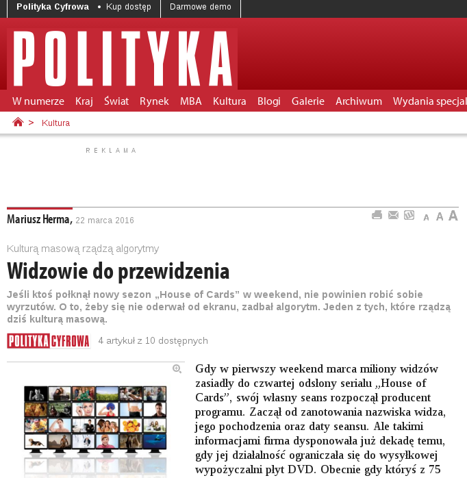 Od niedawna artykuły do słuchania pojawiły się bezpośrednio i za darmo na stronie tygodnika Polityka, gdzie można ich odsłuchiwać online. To odważna decyzja ze strony Polityki, którą należy pochwalić a dla fanów słuchania to świetna wiadomość. Tygodnik już od kilku lat nagrywa w wersji audio około 10 najważniejszych artykułów z każdego wydania. Są to profesjonalnie …
