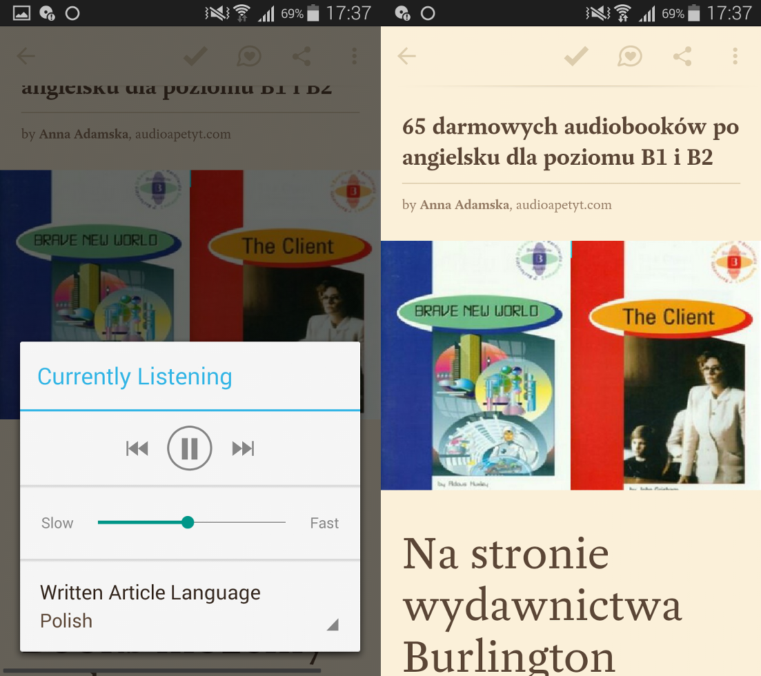 – aplikacja sama odtwarza kolejny plik zaraz po zakończeniu poprzedniego, co jest wygodne zarówno przy słuchaniu audiobooków jak i audio artykułów,
